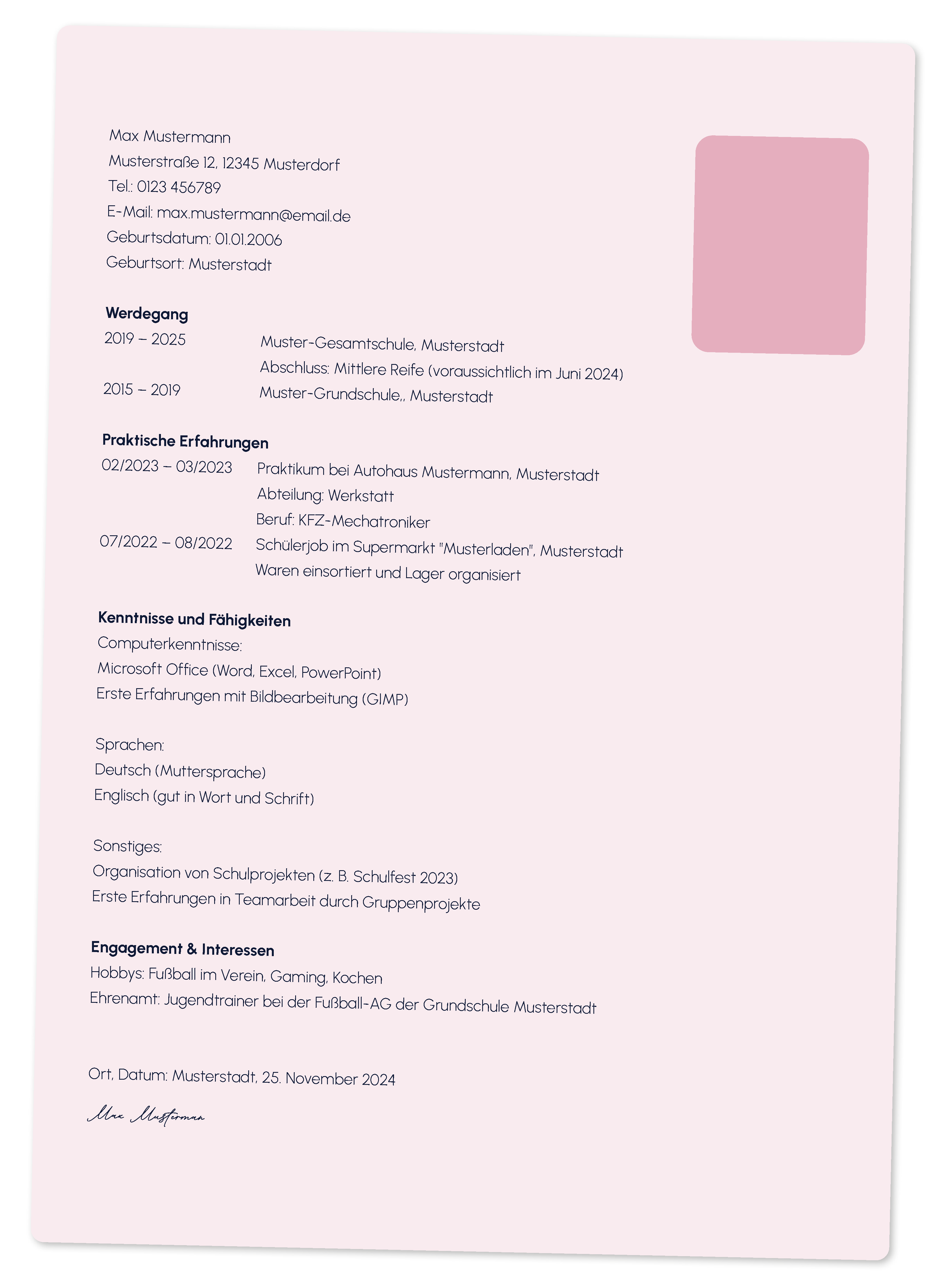 - Schulischer Werdegang: Liste deine Schulen auf (Grundschule kannst du weglassen, wenn’s zu voll wird). Dein Abschluss: z. B. „Realschulabschluss, voraussichtlich Sommer 2024“.
